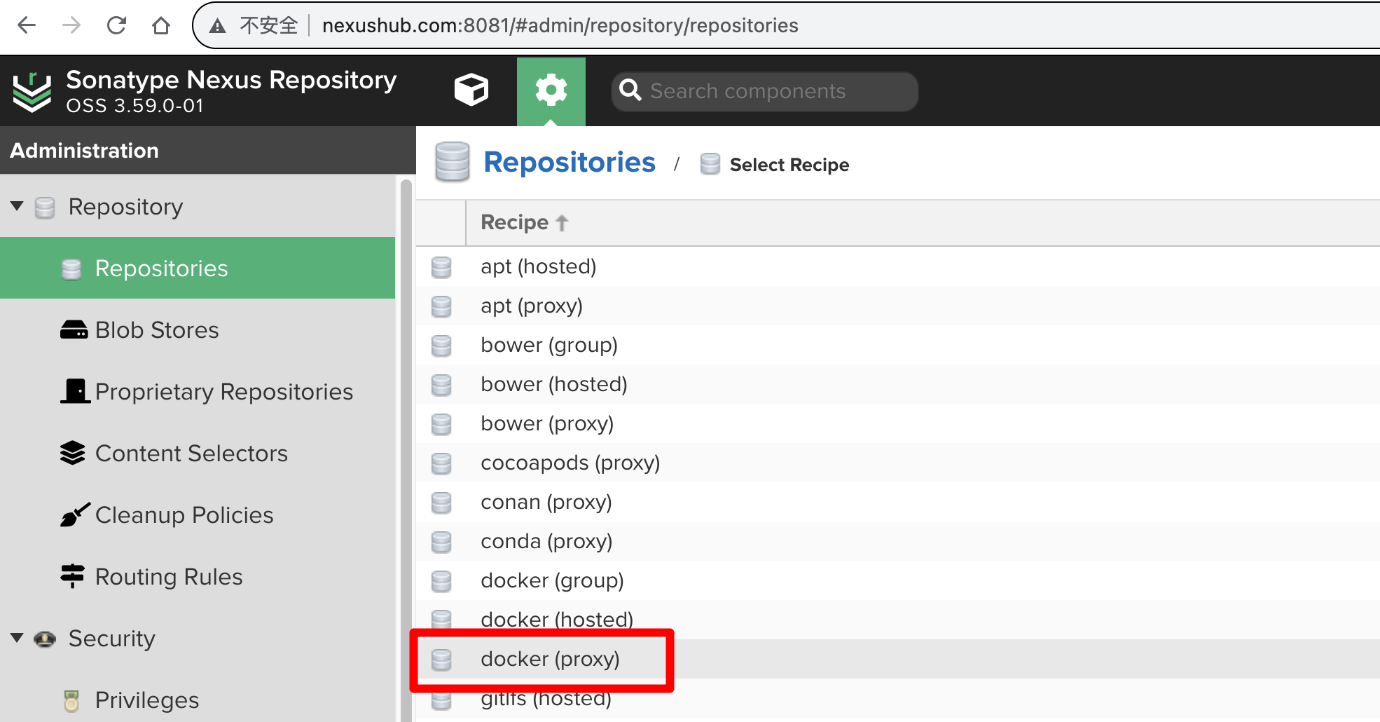 进入到设置页面后,点击左侧的【Repositories】进入到仓库管理页面,点击【Create Repository】按钮,我们需要使用的docker仓库,以看到docker(proxy):