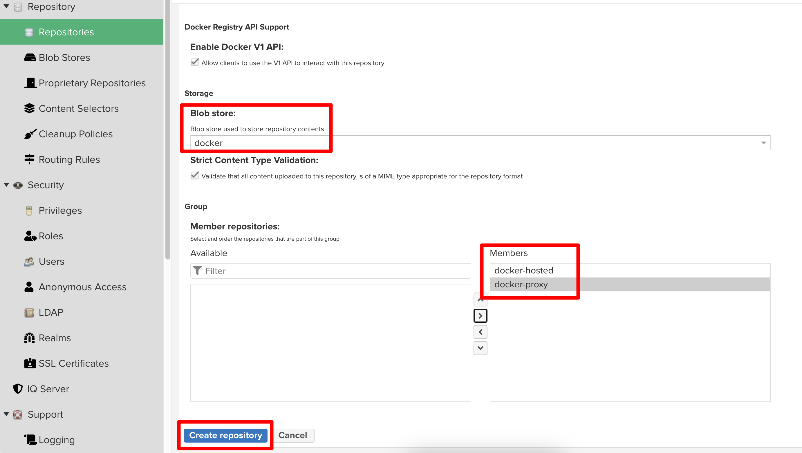 - Group: Member Repositories,将【docker-hosted】和 【docker-proxy】添加到右侧,这里成员仓库的顺序可以稍微规划下,一般来说将本地的放前面,代理第三方的放后面,好处就是优先使用本地或小众的镜像仓库。