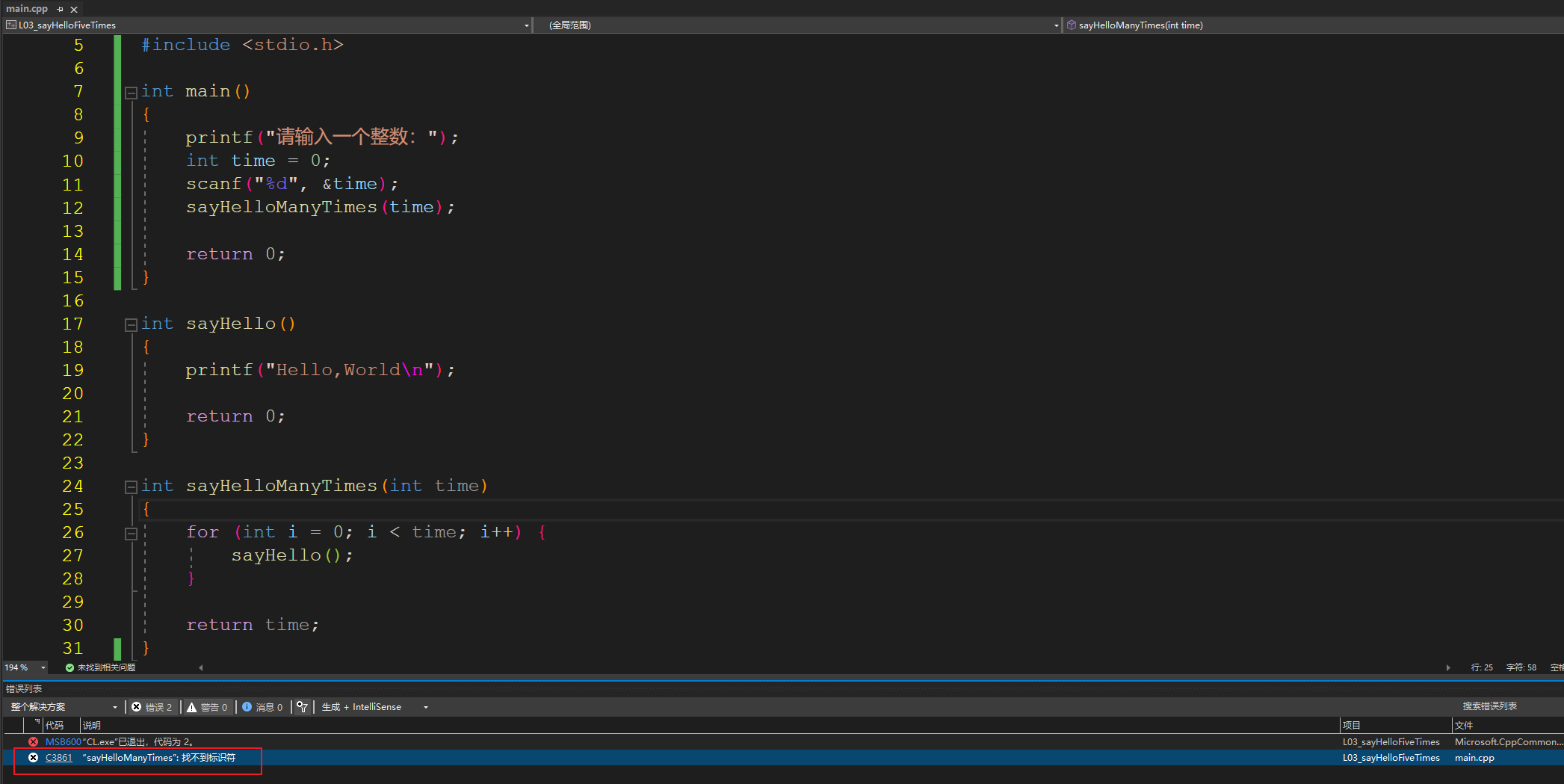 提示异常,错误代码C3861,错误说明“sayHelloManyTimes”: 找不到标识符,即找不到标识符。