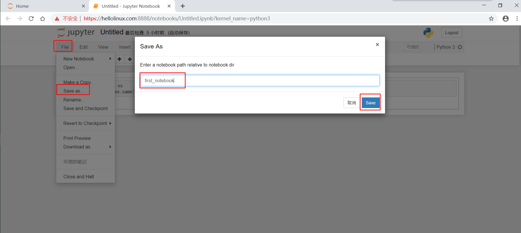 root 12179 7909 0 17:19 pts/0 00:00:00 grep --color=auto jupyter在浏览器中访问jupyter notebook,链接地址: https://hellolinux.com:8888
