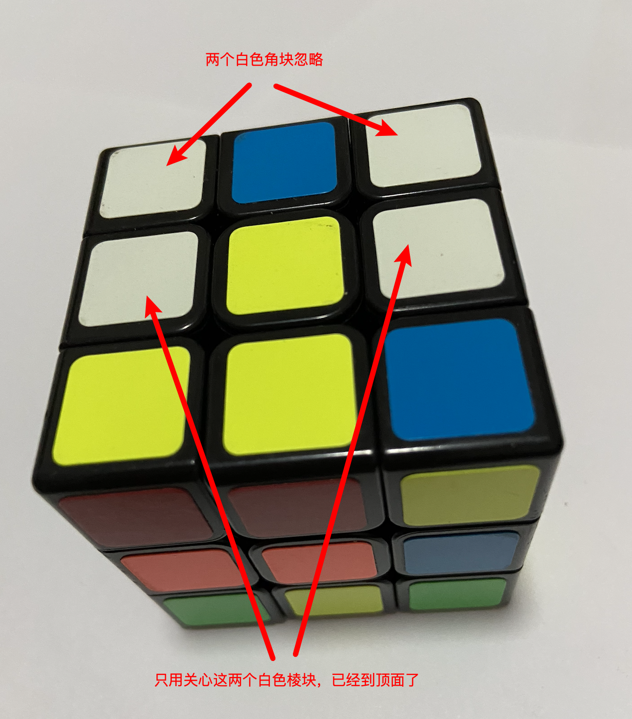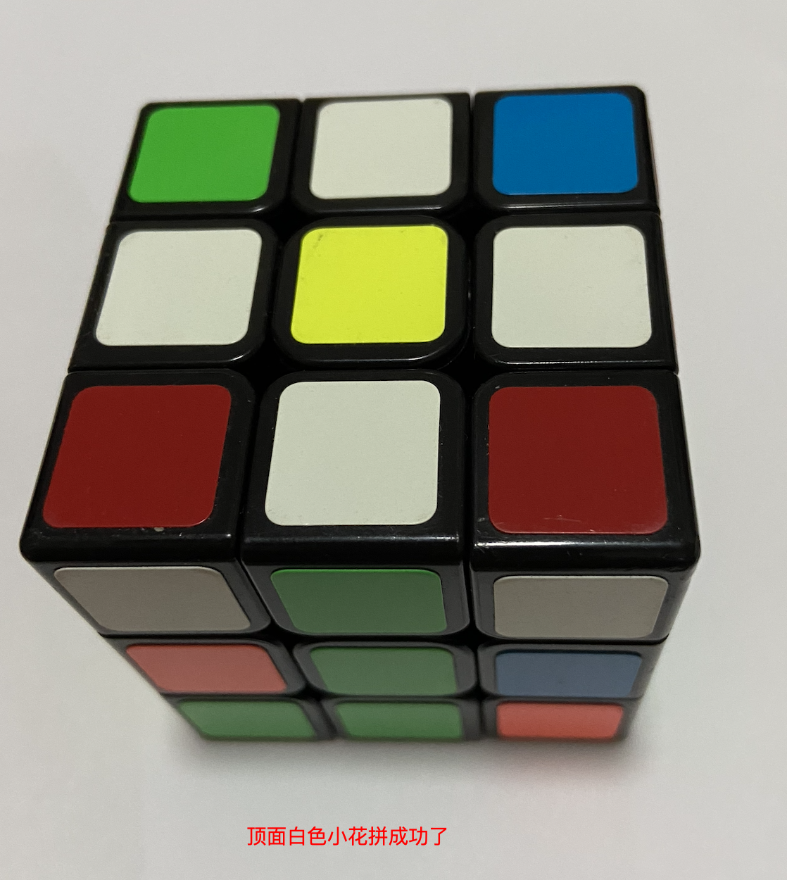 首先,还是将黄色中心块放在最上面,白色中心块放在最下面。然后依次处理顶面的4个白色棱块,此时需要对一下颜色。