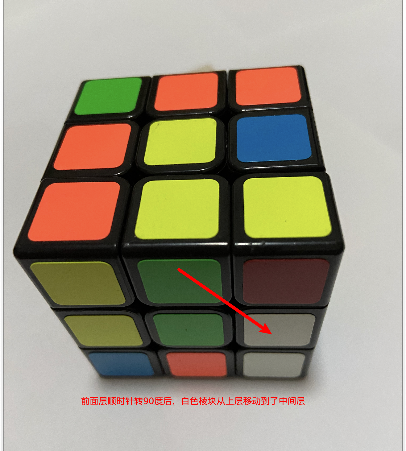 白色棱块在中间块时,是最简单的一种情况,因为在中间层的话,我们想把它放在顶面的黄色中心块的边上,只需要转一下就可以跑到顶面去了。