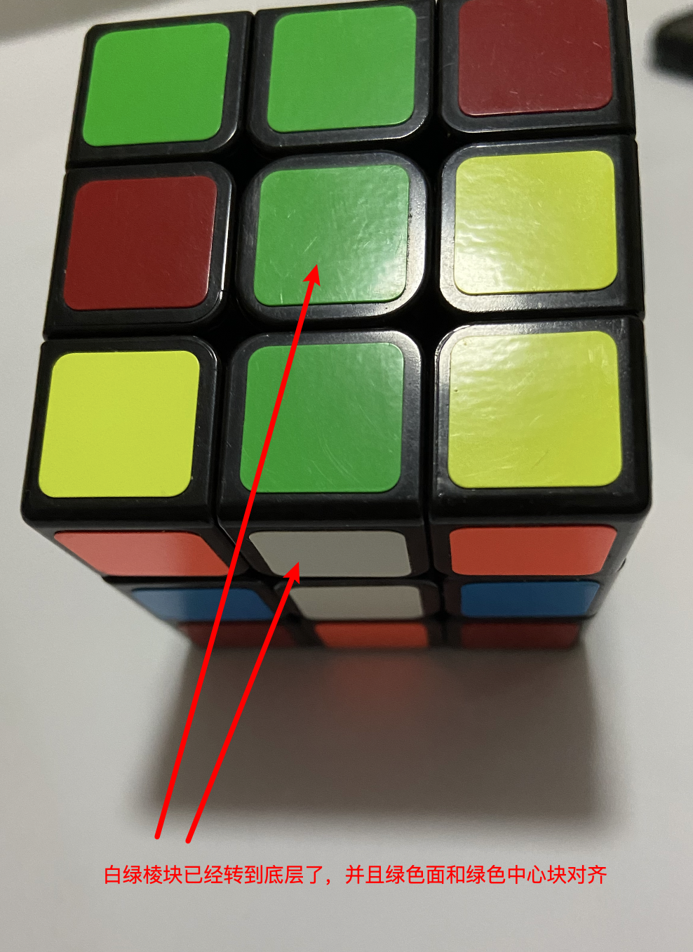 如白绿棱块,绿色一面已经与绿色中心块接上了,此时直接将右面转到180度,将白绿模块放到底层去。这样白绿棱块就处理好了。