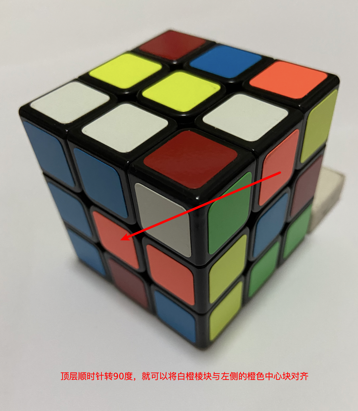 此时,再处理顶层剩下的两个白色棱块:白橙棱块和白蓝棱块,我们先处理白橙棱块:
