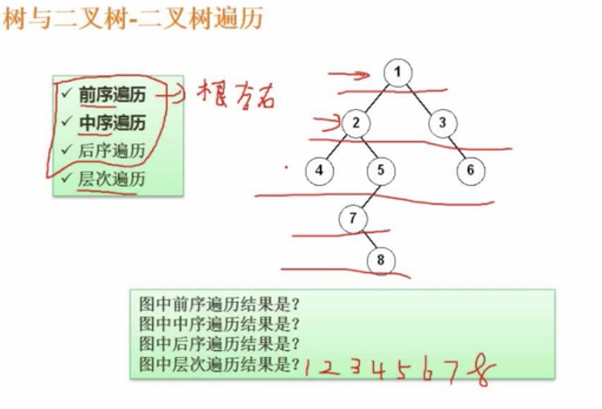 - 图中层次遍历结果是:1(第一层)、2、3(第二层)、4、5、6(第三层)、7(第四层)、8(第五层)。