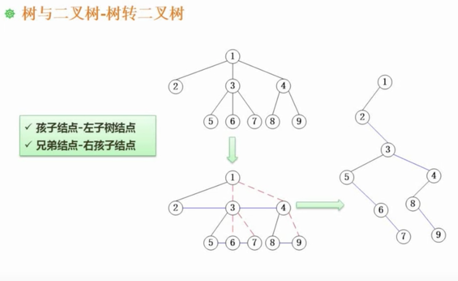 如示例中,1转换成二叉树的根节点,2、3、4都是根节点1的孩子节点,因此2、3、4都会转换成1的左子树结点。