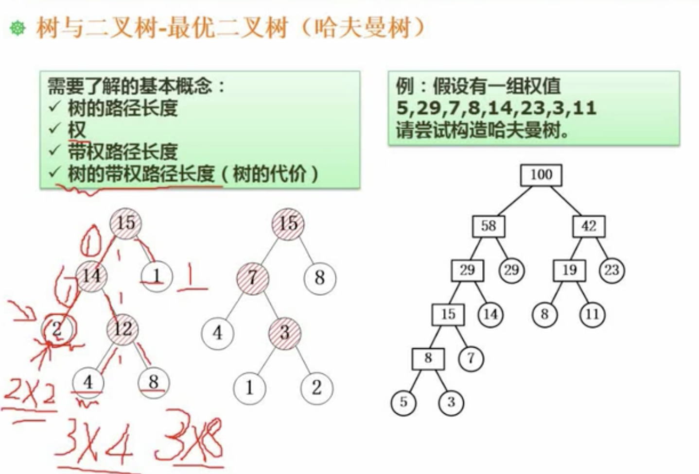 可以发现左边的树的带权路径长度 = 2*2 + 3*4 + 3*8 + 1*1 = 41。而右边的树的带权路径长度 = 2*4 + 3*1 +3*2 + 1*8 = 25。