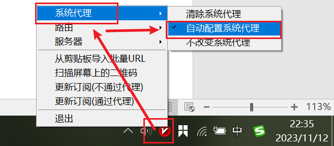 最新版本V2RayN的系统代理默认关闭,开启方法:在任务栏找到V字图标,右键点击。悬停在【系统代理】选项卡,在弹出选项中选择【自动配置系统代理】。