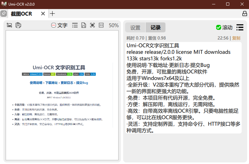 - Umi-OCR 是一款免费、开源、可批量的离线 OCR 软件,基于 PaddleOCR,适用于 Windows10/11 平台。